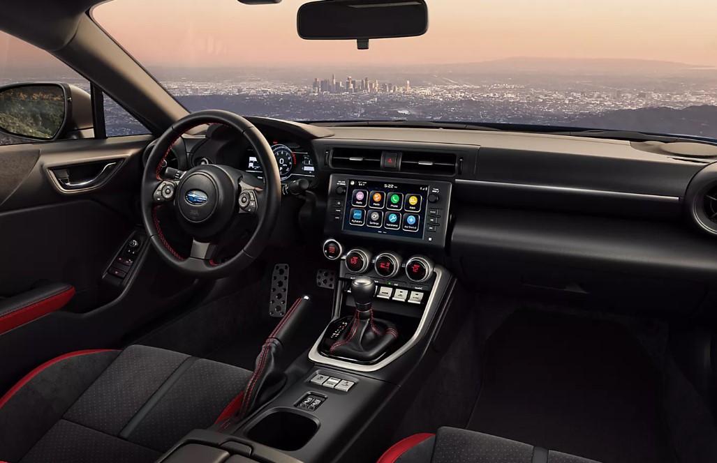 The 2025 Subaru BRZ Premium is the base trim, and it comes with a standard Black cloth interior as well as a leather-wrapped steering wheel and shifter handle with red stitching. The BRZ Limited gets a Black/Red Ultrasuede and leather-trimmed interior with distinctive red contrast stitching. New for 2025, Limited’s black Ultrasuede seats now feature red leather contrast stitching, and there are more red accents throughout the interior as well.