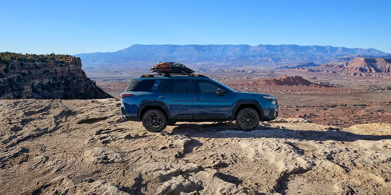The 2026 Subaru Outback Wilderness offers all-new redesigned rugged, modern style and a revamped exterior shape. For 2026, the Outback Wilderness adds more protective style with new modern body architecture and new grille and headlights. The 2026 Outback Wilderness has upgraded heavy-duty roof rails, which will support up to 800 lbs, new 17-inch matte black-finish alloy wheels and Bridgestone Dueler™ all-terrain tires.